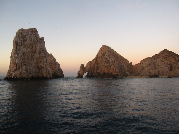 Three large rocky outcroppings rise out of a dark blue body of water. Two are connected, with a small archway on one end. The other sits isolated on the left. On the horizon, the sky is peach-colored. A peaceful landscape.