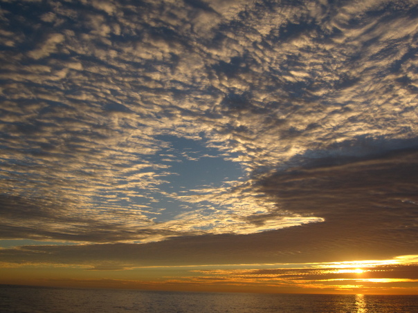 Fluffy white clouds accent a serene sunset over sparkling blue water.