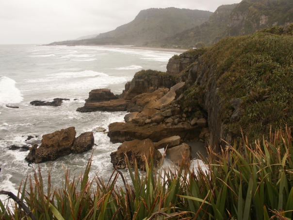 The Pancake Rocks are a popular tourist goal at Dolomite Point south of the main village. The Pancake Rocks are a heavily eroded limestone area where the sea bursts though a number of vertical blowholes during high tides. Together with the 'pancake'-layering of the limestone (created by immense pressure on alternating hard and soft layers of marine creatures and plant sediments), these form the main attraction of the area.