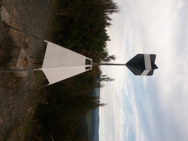 This is a photo of a device, possibly a windmill of some sort, on a hill overlooking a scenic area.