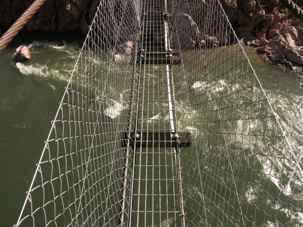 A picture taken looking down on a metal bridge that is over water.
