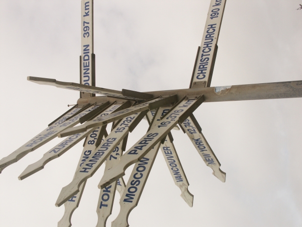 pole with multiple white with blue worded signs on it
