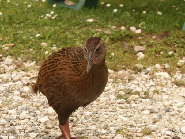 It is a brown, small bird standing on gravel.