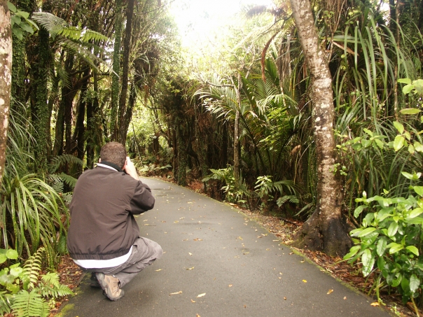 Man squatting on paved trail in jungle holding something.