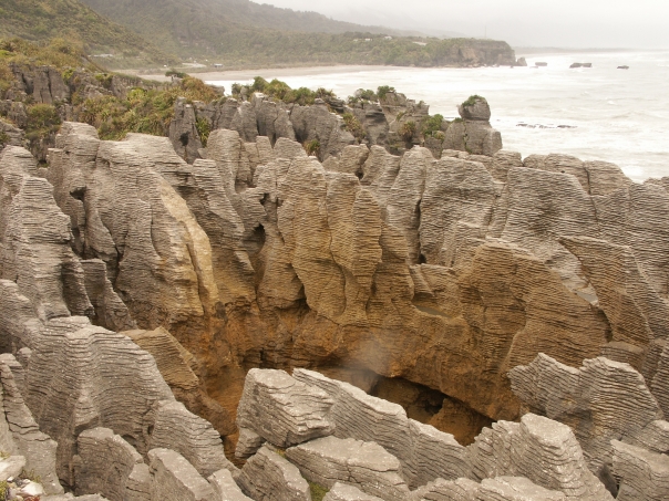 The Pancake Rocks are a popular tourist goal at Dolomite Point south of the main village. The Pancake Rocks are a heavily eroded limestone area where the sea bursts though a number of vertical blowholes during high tides. Together with the 'pancake'-layering of the limestone (created by immense pressure on alternating hard and soft layers of marine creatures and plant sediments), these form the main attraction of the area.