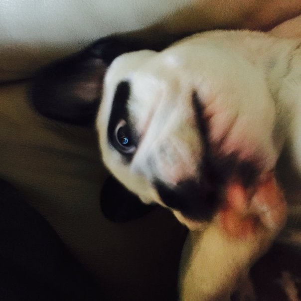 Two nights ago Kevin asked me to come over. He sat me on his couch and said, "Girlfriend, I have something for you. It's a surprise. You must close your eyes." When I opened them I saw the cutest creature I'd ever laid my eyes on! He knew I'd been scanning ads and rescue groups endlessly trying to find a bulldog, with no luck. He knew I couldn't afford most, so I was limited in my search. All I have to say is that this (she) is THE most amazing gift I have ever received!! Thank you, Sweetheart! I am sooo happy to have Panda Bear the Frenchie as my newest loving companion!!