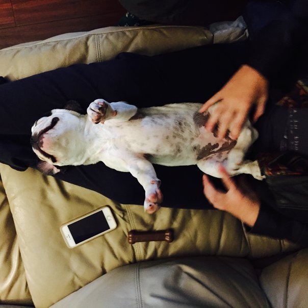 Two nights ago Kevin asked me to come over. He sat me on his couch and said, "Girlfriend, I have something for you. It's a surprise. You must close your eyes." When I opened them I saw the cutest creature I'd ever laid my eyes on! He knew I'd been scanning ads and rescue groups endlessly trying to find a bulldog, with no luck. He knew I couldn't afford most, so I was limited in my search. All I have to say is that this (she) is THE most amazing gift I have ever received!! Thank you, Sweetheart! I am sooo happy to have Panda Bear the Frenchie as my newest loving companion!!