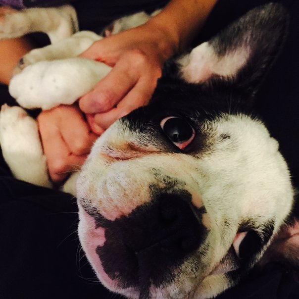 Two nights ago Kevin asked me to come over. He sat me on his couch and said, "Girlfriend, I have something for you. It's a surprise. You must close your eyes." When I opened them I saw the cutest creature I'd ever laid my eyes on! He knew I'd been scanning ads and rescue groups endlessly trying to find a bulldog, with no luck. He knew I couldn't afford most, so I was limited in my search. All I have to say is that this (she) is THE most amazing gift I have ever received!! Thank you, Sweetheart! I am sooo happy to have Panda Bear the Frenchie as my newest loving companion!!