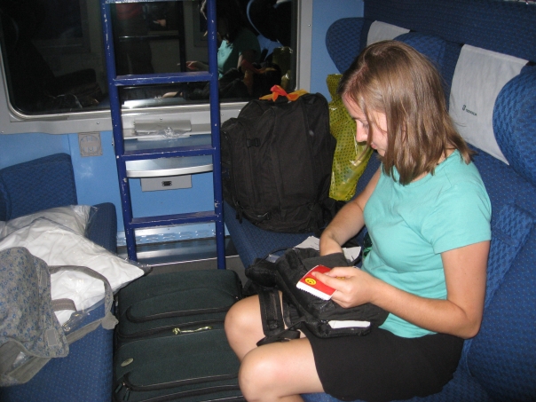 A traveler reaching into her ebony sack while sitting on the blue seat of the train.