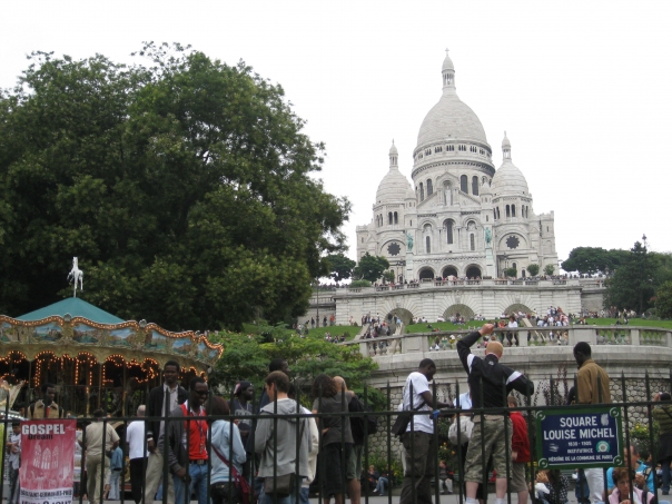 We adjusted to Paris rather quickly yesterday and went to the Louvre last night. The museum grants free admission to everyone under 26 on Friday nights, so we felt very travel smart as we enjoyed 3 hours of mummies, artifacts, and of course, Mona. After our visit to perhaps the best museum I have ever seen, Tracy informs me that for dinner she wants some "pomme frites." In France, as you may already know, that you don't have to call the fries French. After our dinner we headed back for a rest and hit the Montmartre quarter for the flea market today. Then we walked to the Moulin Rouge, The Sacred Heart Basilica, and a cemetary whose headstones include Proust, Oscar Wilde, Chopin, and Jim Morrison. Guess whose headstone had the most security? Apparantly, Morrison's fans have been a bit rowdy over the years and now there is a guard as well as a code of conduct leaflet outlining the rules for visiting his remains. I wonder how Jim feels about these restrictions. Keep reading for one more day of Paris excitment!
