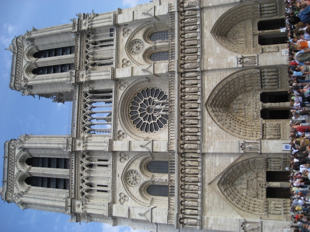Many tourists out in front of Notre Dame Cathedral in Paris, France.