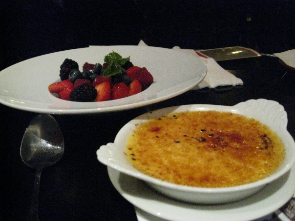 A mahagony dinner table with white serving dishes containing summer fruits and creme brulee.
