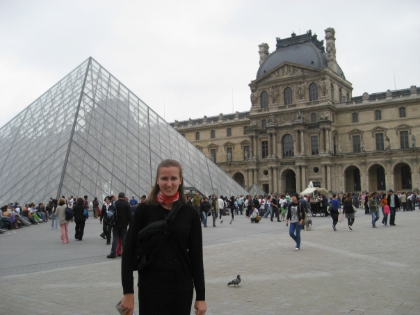 A woman dressed in all black standing in front of the pretty Louvre.