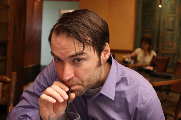 The man in the purple shirt is using a straw to enjoy his drink at the coffee shop.