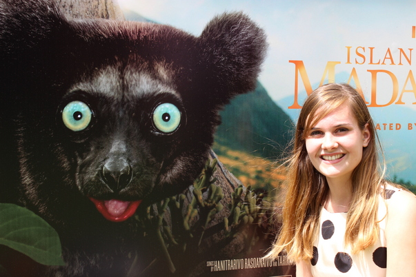 This is a young woman wearing a polka dot shirt standing in front of a giant poster of a lemur.