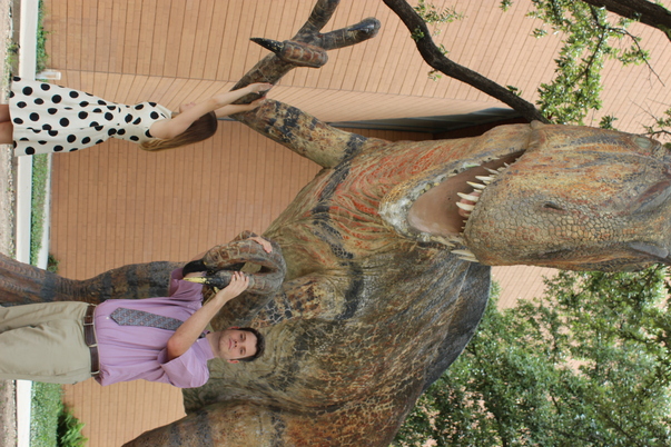 A man in a purple dress shirt with woman in a dress posing with a fake T-Rex