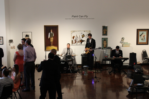 This is a live band playing in front of an exhibit labeled Paint Can Fly.