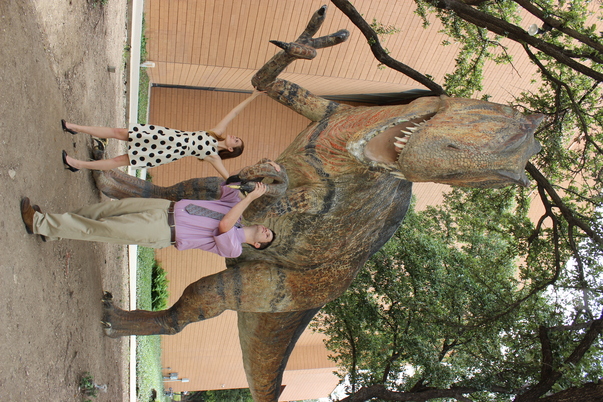 In this sideways picture, a man and woman in professional looking garb are interacting with a fake t-rex statue.