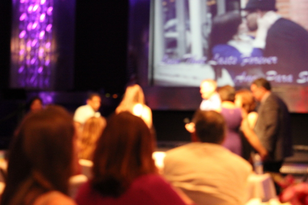 This is a blurry picture of a group of people and what appears to be a movie being projected onto a screen.