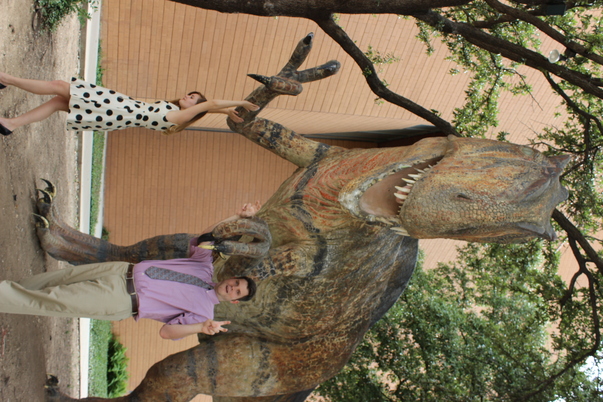 This is a man and a woman wearing formal attire and standing in front of a T-Rex statue.
