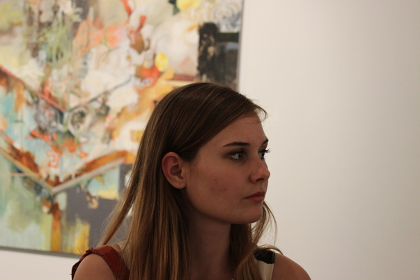 Very pretty girl with long, brown, straight hair is standing in front of a colorful painting on the wall.