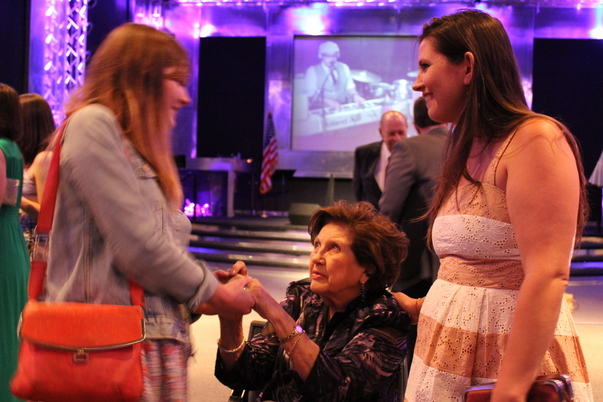An older lady sitting in a wheelchair with a young lady beside her is shaking the hand of another young lady who is wearing a blue jean jacket and holding a red shoulder purse.