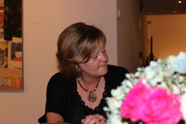 A frowning sandy haired woman sitting behind a bouquet of pink and white flowers.