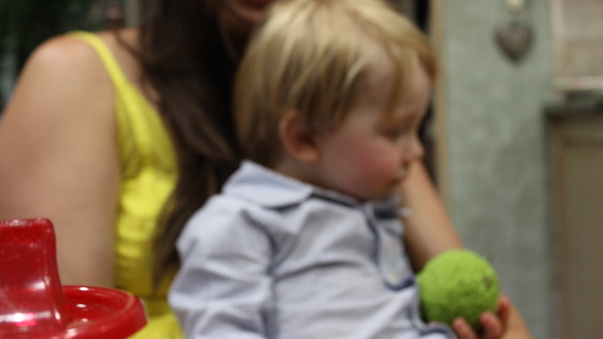 A blonde toddler in a blue oxford shirt holding a green ball.