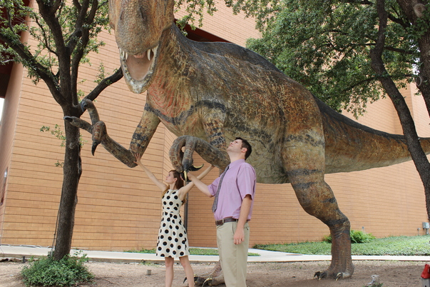 A man in a lilac shirt and a woman in a black-dotted white dress pose dramatically with a large outdoor statue of a T. Rex.