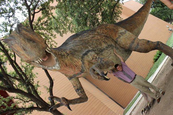 A man dressed for the office in khakis and a purple shirt with tie pretends to be holding up a scary dinosaur statue.