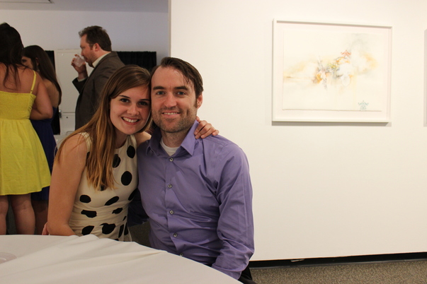 A happy couple at an art gallery, sitting at a white table with other people socializing in the background.