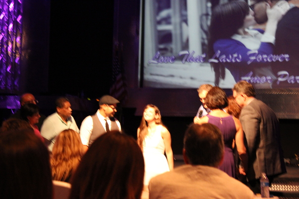 Family and friends celebrate a dedication of marriage at an auditorium.