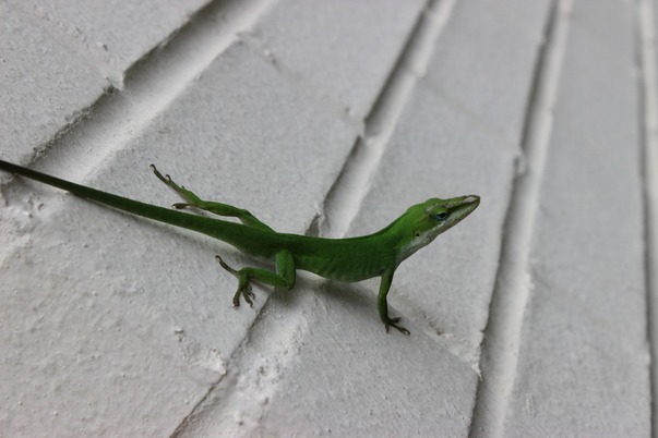 This is a green lizard that is walking on a white brick wall.