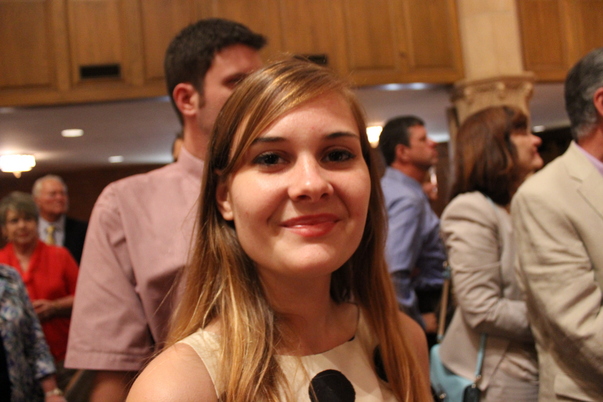 This is a woman with brown eyes wearing a black and white polka dotted dress or shirt and standing among a group of people.