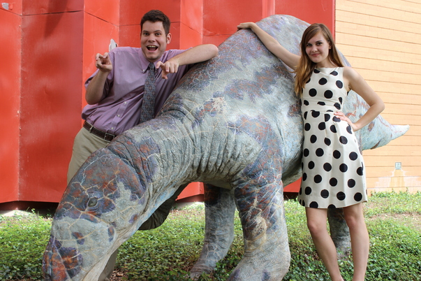 A happy vacationing couple takes the time to pose with and animal display on the grounds