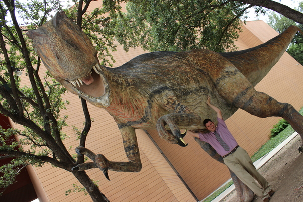 giant t-rex an looks like a co worker of the museuem or prehaps a sharp dressed man doing the photo for his kids an saying look i can lift the t-rex rawwwrr.