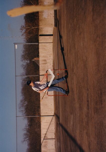 A male wearing a white shirt, blue jeans, and black hat is outside playing floor hockey in the dirt. |