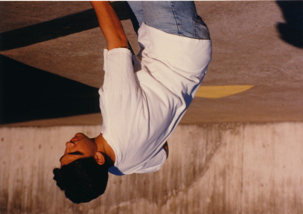 boy with white shirt and blue jeans i slouched position riding a skateboard |