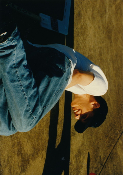 A guy in a black cap lays on what appears to be the ground laughing. |