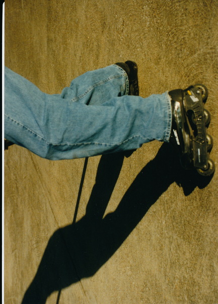 The bottom half of someone wearing bluejeans roller skating on cement. |