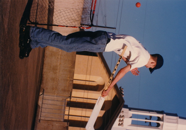 An adolescent boy plays street hockey outside wearing his rollerblades on a warm, sunny day. |