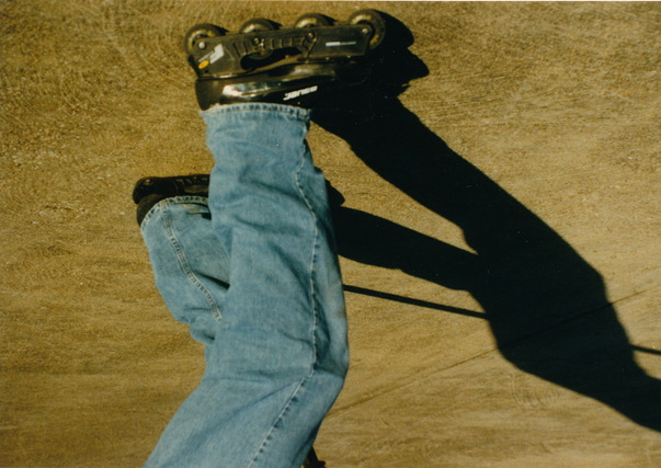 A person is roller blading on the sidewalk in the middle of a sunny day. |