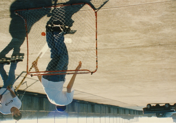 upside down pic of two men playing street hockey wearing white shirts an blue jeans the one with the hockey stick looks very admirable on making a goal.