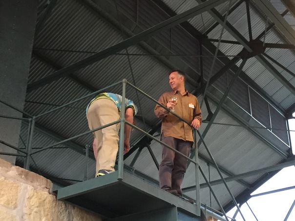 Two gentlemen up on a platform during the day one is holding a wineglass and looking down at the other one.