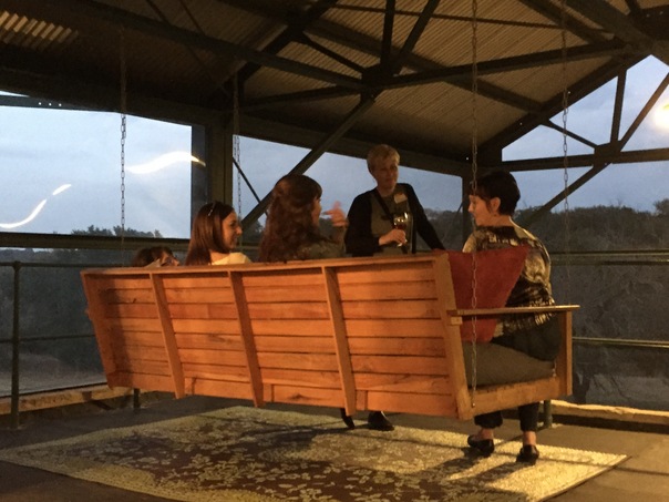 Several people sit on swinging bench under a gazebo.