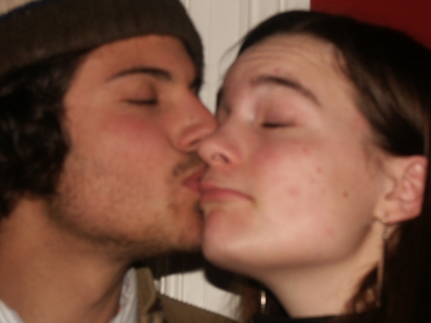 A guy is kissing an unamused lady with pimples on the cheek.