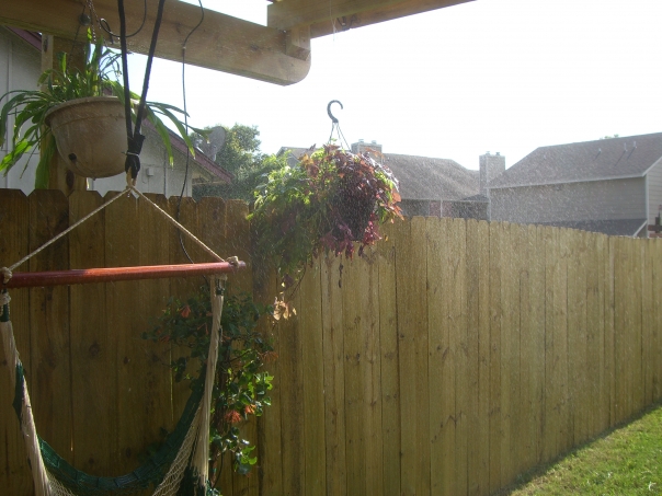 View of fence with a hanging plant and part of a hammock