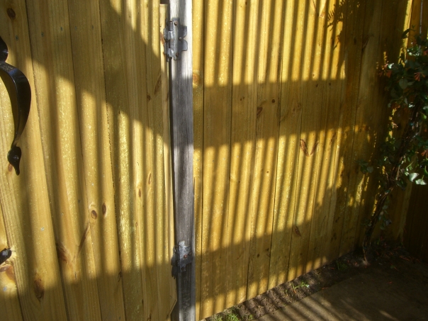 Linear shadows of one fence cast onto another create a tight, ambiguous spatial composition.