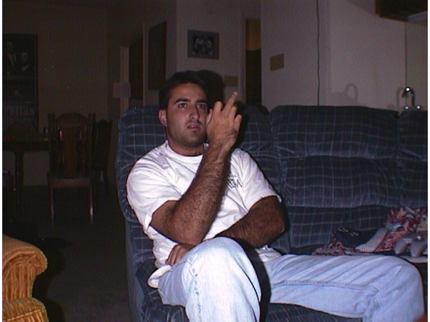 A man is sitting in a chair wearing white shirt and jeans holding up his middle finger lol.