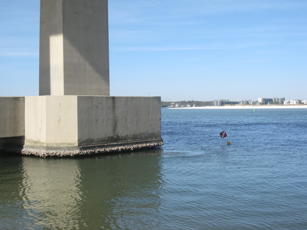 This is a picture of a pillar for a bridge over a river where people can fish or swim or sail on a boat.